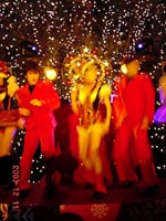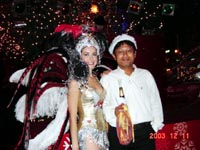いつもは絵などが飾ってあるフロアは様々な色のネオンで飾られ、飲み放題のシャンパンを煽るジャパニーズビジネスマンは早くも浮き足立ち気味。チョコレートを貰えるルーレット台や舞台上のダンサー達が華やかな雰囲気を盛り上げます。結構暗いので写真写りが悪くきれいに取れていませんが、場内では曲芸師やトランプ奇術師(これは目の前でやっていても、全然わからず凄くてマイッタ)、歌手が切れ間無く来場者を盛り上げます。